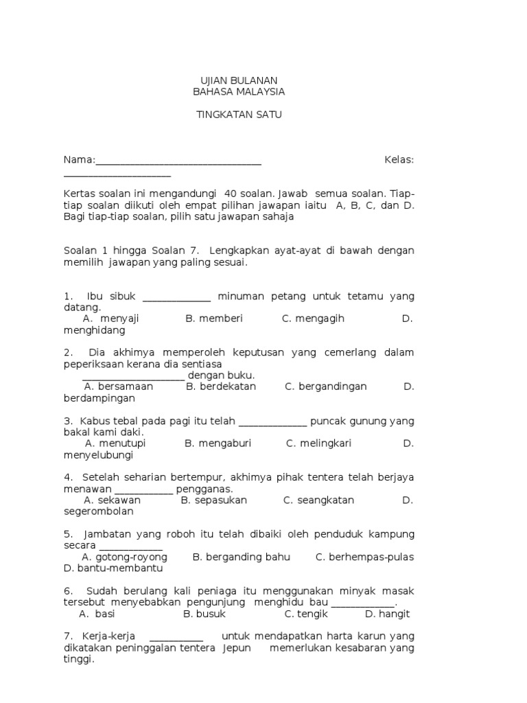 Contoh Set Soalan Ujian Mac Bahasa Melayu Tingkatan 1